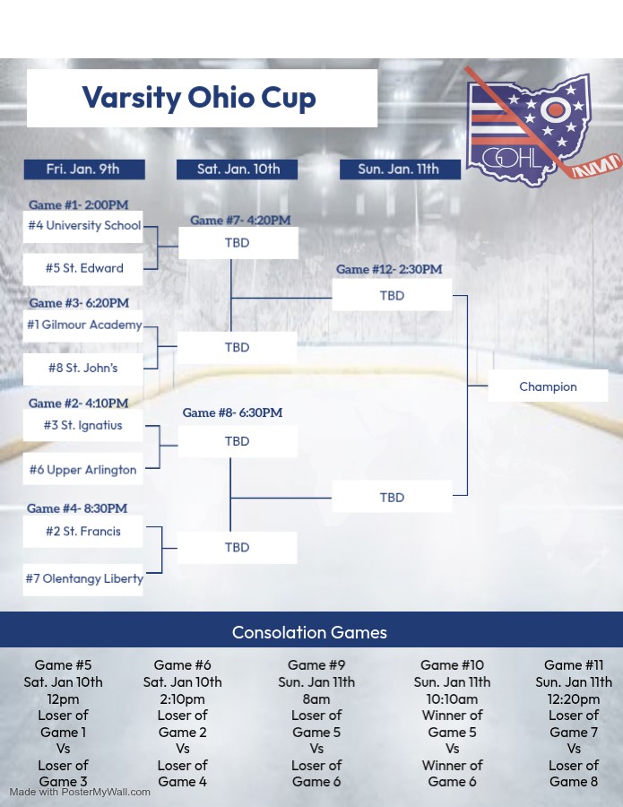 The 2025/2026 Ohio Cup Tournament Schedule has been released. Each team will play 1 game each day on Friday, Saturday, and Sunday. All Varsity games will be played on the East Rink at Brunswick Auto Mart Ice Arena in Strongsville, Ohio.